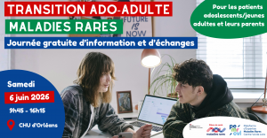 Nous souhaitons vous informer que le groupe de travail inter-filières Transition, en collaboration avec la Plateforme d’expertise maladies rares Centre-Val de Loire et le CHU d’Orléans, organise une journée transition à Orléans le samedi 6 juin 2026 de 9h45 à 16h15 à destination des patients adolescents/jeunes adultes porteurs de maladies rares et leurs parents/accompagnants ! Cette journée, gratuite, a pour objectif d’aborder les défis liés à la transition des services pédiatriques vers les services adultes à l’hôpital, et de faciliter la prise d’autonomie des patients à travers des ressources adaptées.